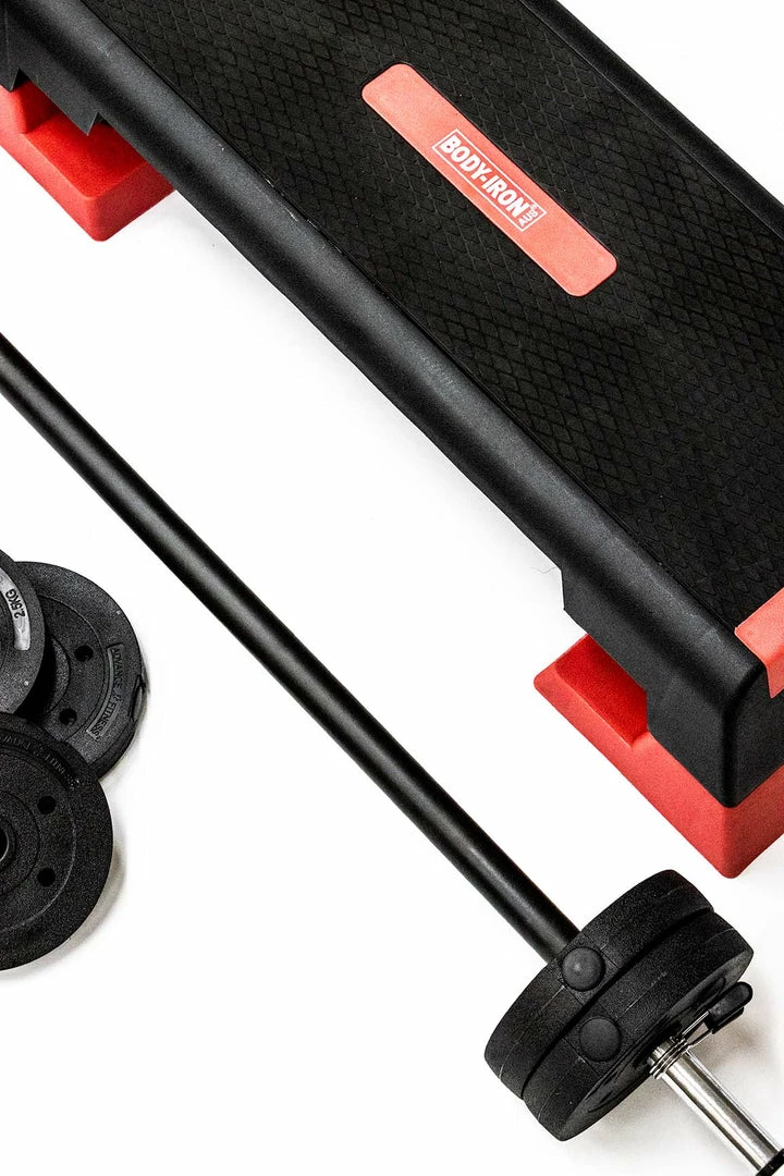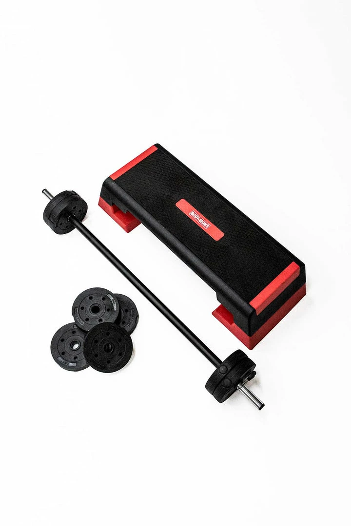 Including 8 X 2.5kg weight plates, barbell, pair of spring collars and adjustable aerobic step, this gym set-up requires minimal space whilst offering maximum results.Â