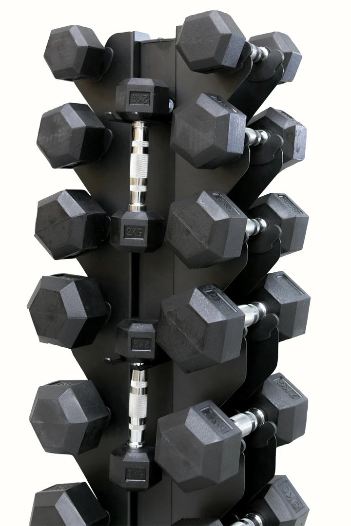 This Body Iron Commercial Vertical Hex Dumbbell Rack can hold up to 10 pairs of hex dumbbells, ideally suited to a 1 – 10kg set.Â