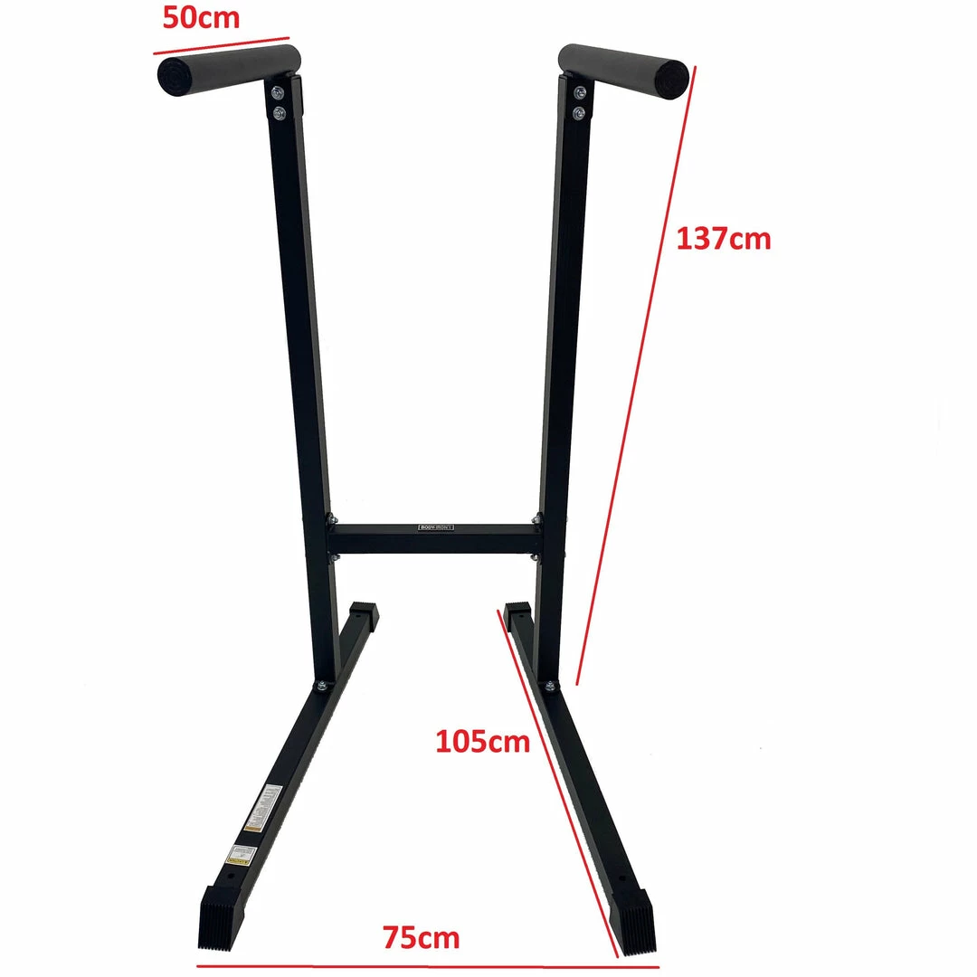 Doing Dips is one exercise that can build strong shoulder muscles, develop amazing pecs and defined triceps. The dip station is the perfect equipment for that. It has a solid wide base to provide stable platform and eliminate any movement. The grip bars are 50mm thick with texture powder coated for extra grip. The long grip bars with wide opening allow different width grip to target different muscle groups. Approximate assembled dimensions are 137cm H X 105cm L X 75cm W.