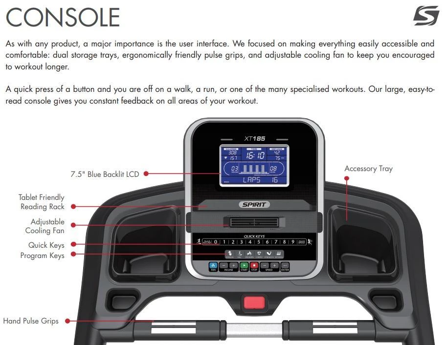 Some of the specific features of the SXT185 include 6 inbuilt programs, various speed and incline levels, a spacious running space, tablet friendly rack, adjustable fan and blue backlit LCD screen.